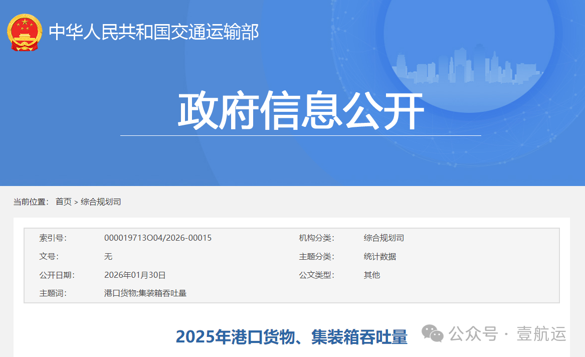 据壹航运获悉:近日,中国交通运输部公布了2025年全年的全国港口吞吐量统计数据。
