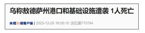 当地时间25日,乌克兰敖德萨州州长奥列格·基佩尔表示,当日凌晨,俄罗斯袭击了敖德萨州的港口和工业基础设施,造成1人死亡、2人受伤。