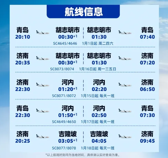 山东航空——1月15日,山东航空在济南遥墙国际机场举行“新航线·新视野”国际航线开航发布会,宣布正式开通济南=河内、济南=胡志明市、济南=吉隆坡、青岛=胡志明市、青岛=河内航线。山航计划1月1日开通青岛-胡志明航线,每周二四六执飞去程,次日返程;1月16日开通济南-胡志明航线,每周一、三、五、日执飞去程,次日返程。山航计划1月15日开通济南-河内航线,1月17日开通青岛-河内航线,均为每日执飞。山航计划1月10日开通青岛-吉隆坡航线,1月18日开通济南-吉隆坡航线,均为每日执飞。