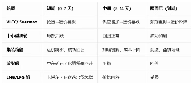 中期(1 周后):运价快速回落(供应增加、风险溢价消失)。